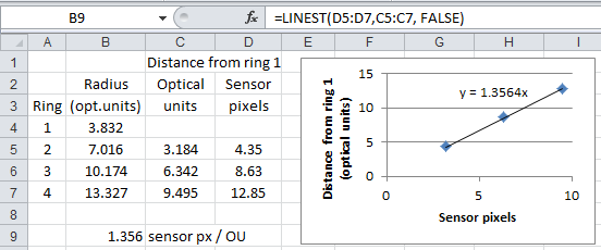 The measured distances from the first Airy pattern minimum ring to the others (the green lines in the inset of figure 1) are in column D in the Excel spreadsheet fragment below. The corresponding distances, in optical units, from ring 1's minimum are in column C (eg., C6 = B6 - B4). The points are plotted on the right. We can use linear regression to find the number of sensor pixels per optical unit; the trend line, which passes through (0,0), shows the result. The Excel function for that (LINEST) is in cell B9; its formula is displayed at the top.