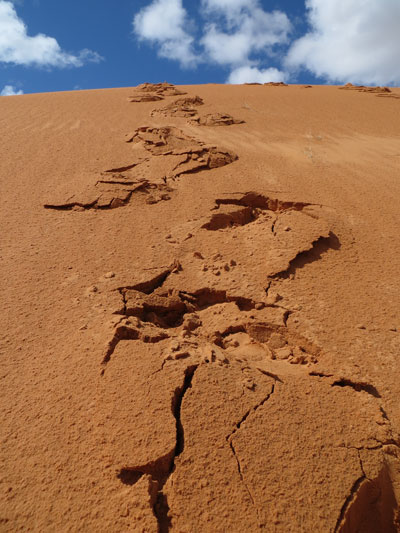 Fig 5. Rain-moistened sand on a slipface, broken by human footsteps. Dry sand underlays the approximately 2 cm of moist sand.