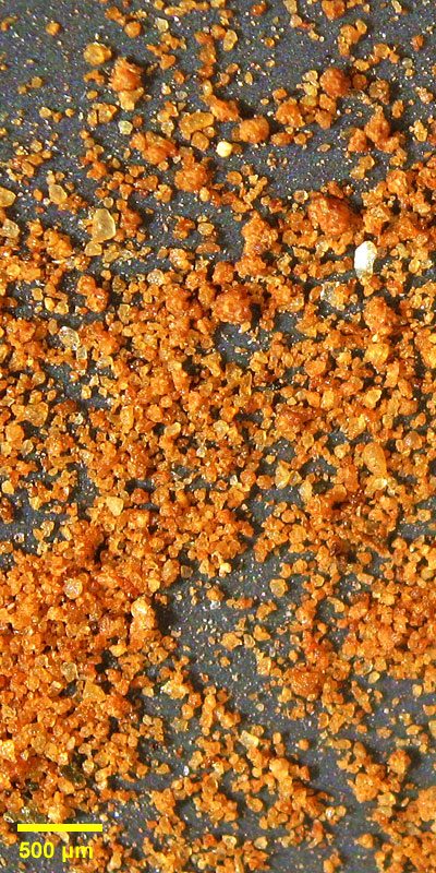 Obtained from an overhanging outcrop by gently rubbing an exposed grainflow stratum and collecting what fell (after discarding the first few surface millimeters). Dull sheen (compared free Navajo grains) is probably due to a diagenetic, unweathered surface coating. Photo of site. |