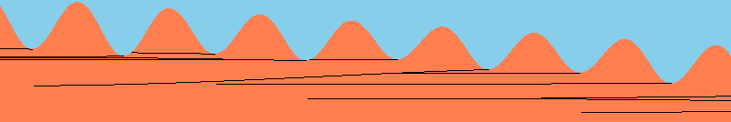 Figure 7 shows what happens if bedform of fixed geometry and unequal trough depths are translated up (by aggradation) and right (by migration). The model is initialized with a train of dunes with trough depths chosen randomly from the gamma probability distribution illustrated in figure 6. The trough tracks are still parallel (because the trough depths aren't time-varying in this configuration) but strata are no longer equally thick, reflecting the unequal differences between successive troughs. Notice that some trough paths are terminated by a subsequent trough that happens to be deeper (eg., the second trough from the left terminates the trough-lines of the two troughs ahead of it, and nearly three ahead).