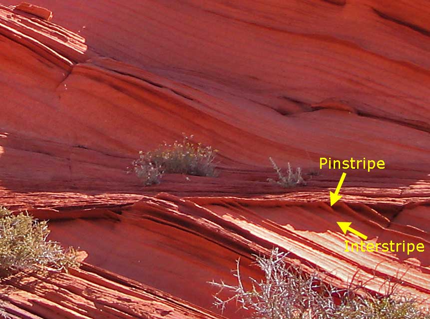 The photo to the right shows where sandstone was sampled. The pinstripe material was obtained by breaking off a small piece (less than 1 square centimeter) of the 1mm-thick 'wafer' protrusion visible in the photo and then gently crushing it between two sheets of paper with slight finger pressure. 'Between pinstripe' grains were obtained by rubbing the 'interstripe' area shown in the photo and collecting the falling grains.
